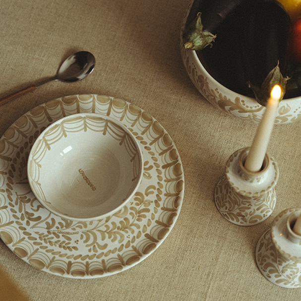 El diseñador ha creado su primera vajilla, desarrollada junto al taller cerámico Torres Ferreras. Jaleo es el título de este proyecto que transforma en platos su colección Menú. Se han empleado para ello dos técnicas, por una parte la de decoración sobrecubierta, empleando un pigmento desarrollado exclusivamente para estas piezas, y por otra, la ancestral manguilla de decoración en relieve.
