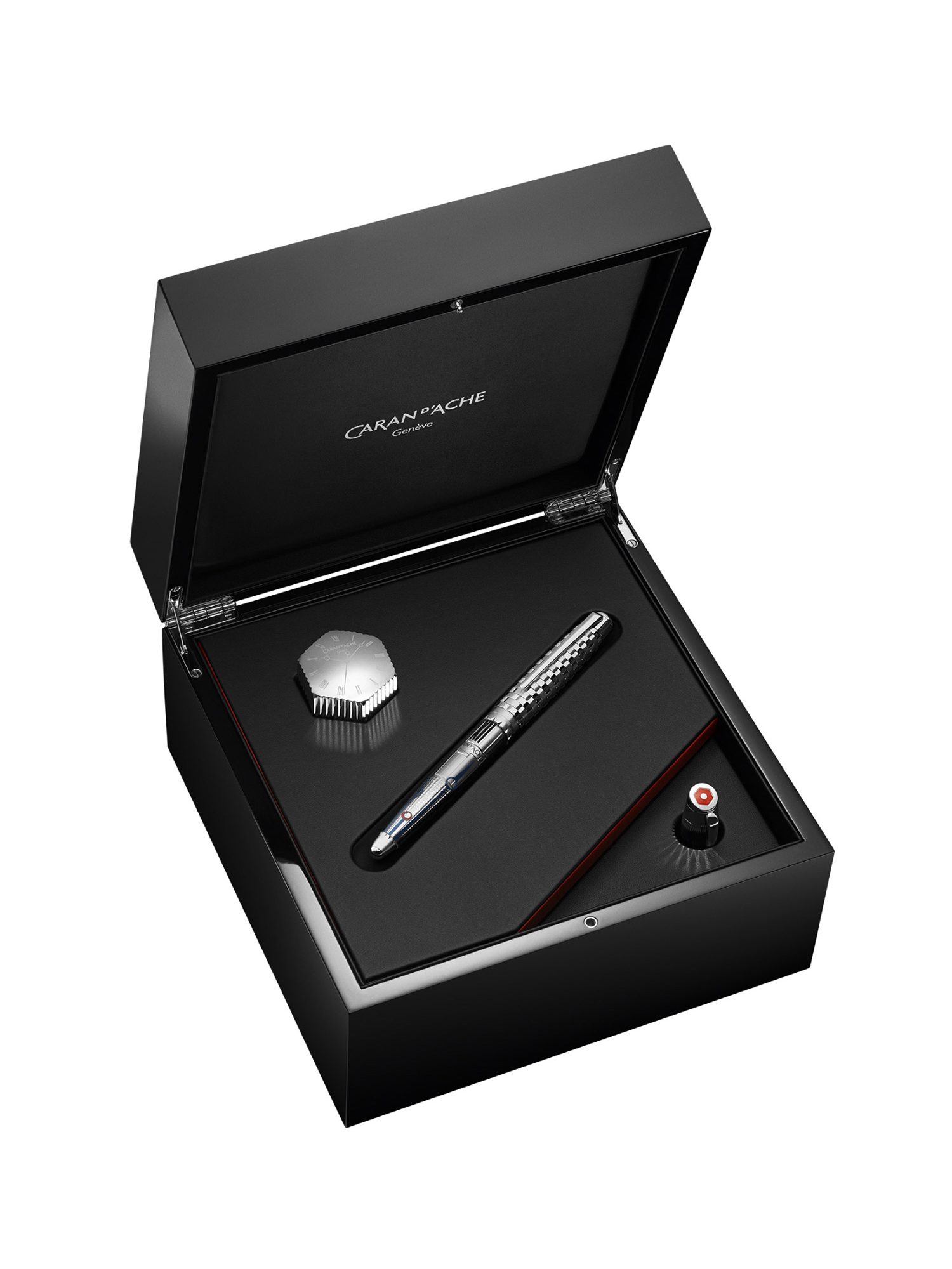 El interior oculta una pequeña esfera suspendida, una réplica simbólica del mundo relojero: manecillas grabadas, números romanos que evocan relojes de antaño, el eco de una tradición que Caran d’Ache transforma en escritura. Es un homenaje íntimo a la medición del tiempo, a la precisión, a la belleza de los mecanismos invisibles. Viene con dos capuchones intercambiables: uno se inspira en la malla metálica de un brazalete de acero y el otro recuerda a la corona con la que se da cuerda a los relojes, como si al escribir pudiéramos poner en marcha algo por dentro.