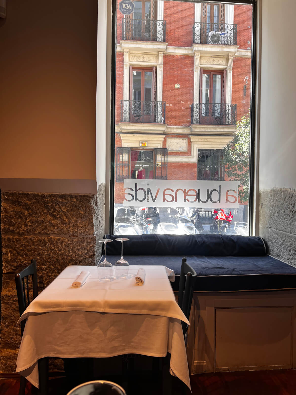Si es posible, lo ideal es la mesa al ladito de la ventana. En cuanto al vino: lo que Elisa diga: sabe muchísimo y los precios están mejor que bien. La raya a la mantequilla negra es absolutamente imprescindible en una primera visita.