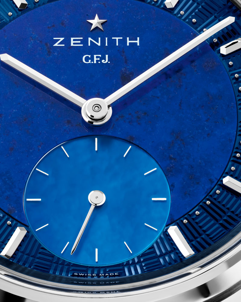Cada componente ha sido decorado meticulosamente, destacando el motivo guilloché en forma de ladrillo, inspirado en la fachada de la manufactura ZENITH. Las letras G.F.J. se integran con orgullo con el diseño, reforzando el vínculo entre tradición e innovación.