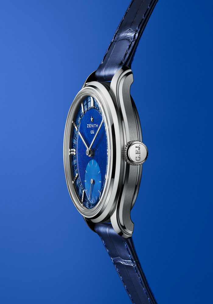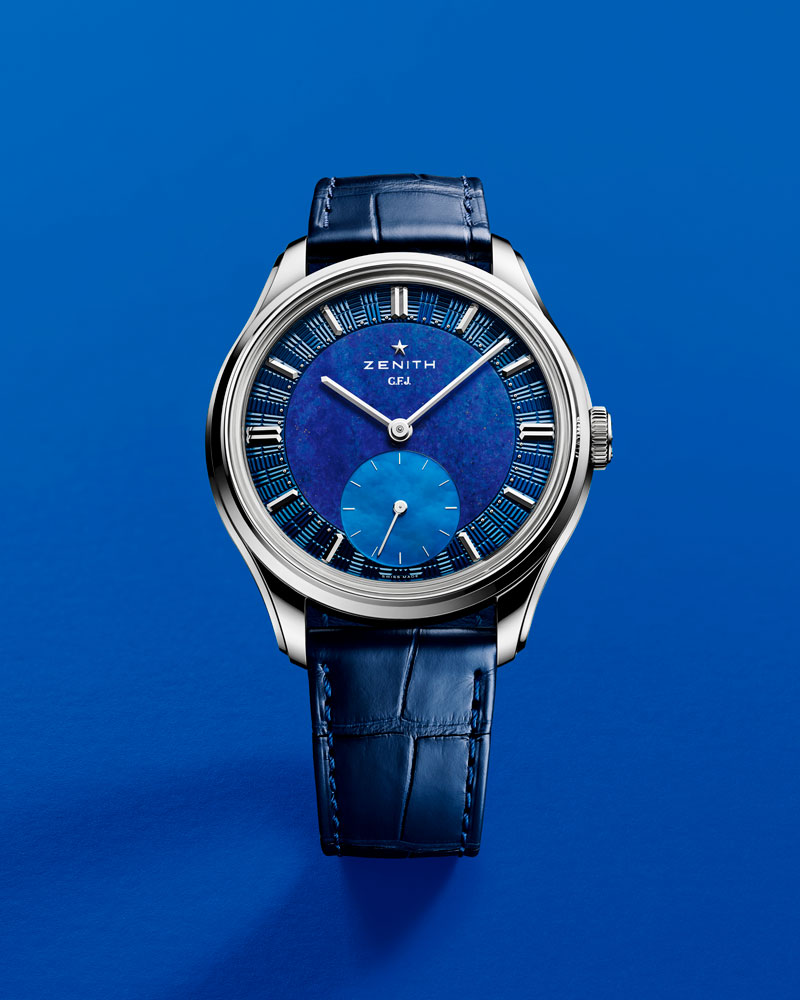 El ZENITH G.F.J. se entrega con tres correas intercambiables: piel de caimán azul oscuro, piel de becerro negra y piel Saffiano azul. También está disponible bajo pedido con un brazalete de platino de siete filas. Su producción está limitada a 160 piezas, disponibles exclusivamente en boutiques ZENITH y distribuidores autorizados.
